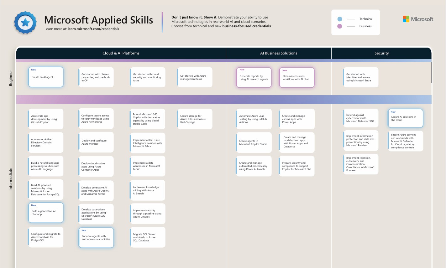 Microsoft uvaja nove poslovno usmerjene certifikate (AI Business Professional, AI Transformation Leader) ter svež nabor Applied Skills za vsakdanje Copilot scenarije in agente, kot sta »Streamline business workflows with AI chat« in »Generate reports with AI research agents«. Gre za sodobna mikropotrdila, ki hitro in jasno signalizirajo UI pismenost v praksi.